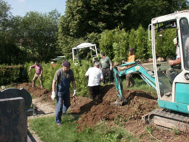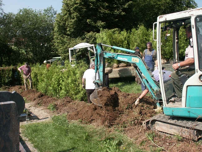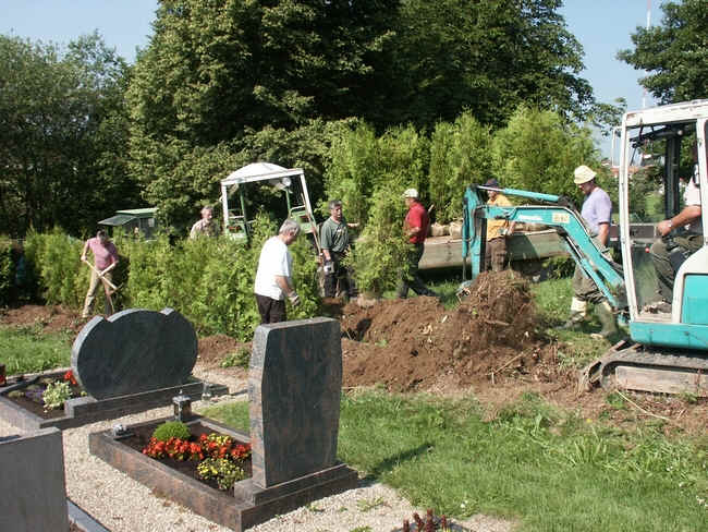 Arbeitseinsatz. Die in die Jahre gekommene Tujaecke, die den Friedhof