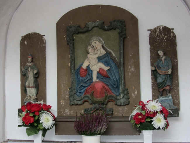 | Das Bild zeigt das Ensemble in der Kapelle in Ünglert. Dieses Kleinod wurde im Jahre 1778 von Sebastian und Eva Müller erbaut. Um die Gottesmutter in der Mitte gruppiert sich rechts der Heilige Wendelin und links der Heilige Valentin. |