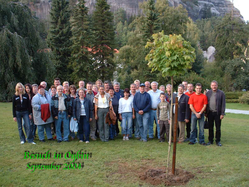 Mitglieder der Freiwilligen Feuerwehr Donebach und des Fördervereins weilten zu einem verlängerten Wochenende im Dreiländereck im Freistaat Sachsen. Sie besuchten die Partnerfeuerwehr von Oybin im Landkreis Löbau/Zittau. Die Partnerschaft mit den dortigen Floriansjüngern ist längst zu einer sehr freundschaftlichen Beziehung geworden. Ausgangspunkt war das Jahr 1992 als F. Brenneis im Rahmen der Verwaltungshilfe in Zittau weilte und diese Kontakte knüpfte. Bürgermeister Hans Jürgen Goth und die Feuerwehr Oybin begrüßten die Donebacher herzlich im Rahmen eines offiziellen Empfangs. Die Gäste aus Donebach hatten einen Baum vom Odenwald mitgebracht sowie ein Luftbild von Donebach. In fröhlicher Runde wurden Erinnerungen der letzten 12 Jahre ausgetauscht. Für die Donebacher hatte die Gemeindne Oybin und Die Feuerwehr wieder eine sehr schönes Programm zusammengestellt. Am nächsten Tag erkundete man den Berg Oybin, mit der Bergkirche und der Klosterruine. Der Hochwald, der höchste Berg des Zittauer Gebirges, auf dessen Spitze die Grenze zu Tschechien verläuft bot einen grandiosen Blick auf das Iser und Riesengebirge in Tschechien. Ein große Schauübung der Jugendfeuerwehr Oybin wurde anläßlich der Gäste aus Donebach vorgeführt. Höhepunkt des Besuches war aber das Pflanzen eines