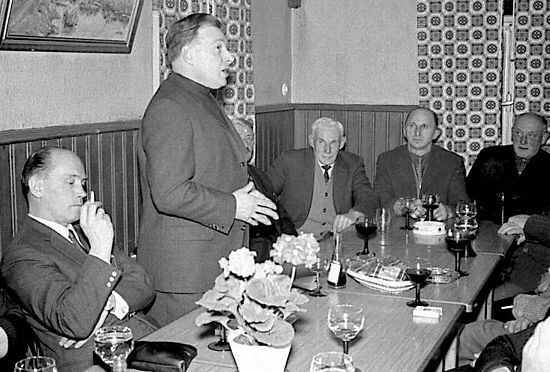 der Schule in Donebach. Nach seinem Wirken in MUdau und Donebach wurde er nach Hechingen-Stein versetzt, wo er bis zu seinem Tod blieb. Am 13. Januar 1966 wurde er in Donebach im Gasthaus zur Linde feierlich verabschiedet. der damalige Unterlehrer Albert Schenk hat mehrere Bilder von dieser Abschiedsfeier zur Verfügung gestellt, und mit dessen Einverständnis sie hier veröffentlicht werden. Ihnen Albert Schenk herzlichen Dank |