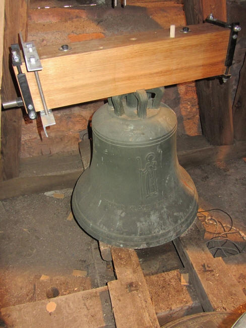 Glockenstuhles der drei Glocken. Der Glockenstuhl, aus Eichenholz von einheimischen Zimmerleuten im Jahre 1954 gefertigt, konnte vollumfänglich erhalten werden. Lediglich die Aufhängung der Glocken, das Antriebsrad, sowie neue Antriebsmotoren mussten ersetzt werden. Seit Mitte Dezember 2013 läuten die Glocken nun wieder. Das Bild zeigt die mittlere Glocke, die dem Heiligen Josef geweiht ist. |
