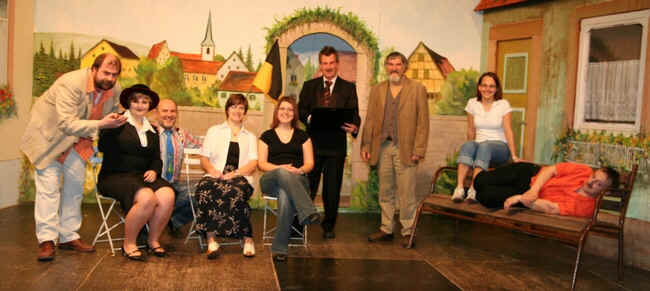 Unter dem Titel ,,Der Loser“ als Lustspiel von Rüdiger von Bergmann hatte das Knopfeck-Theater Donebach wieder einmal eine Vorstellung auf die Beine gestellt, die den humoristischen Nerv des Publikums in Schwarze getroffen hatte. Entsprechend war die Begeisterung im Sportheim-Theater. Am vergangenen Samstag und Sonntag präsentierten die Laiendarsteller den Bergmänn’schen Theaterspaß und da bekanntlich des Künstlers Lohn der Applaus ist, sparten die restlos zufriedenen Theatergäste auch nicht mit diesem und honorierten damit sowohl die überdurchschnittlichen Leistungen der Darsteller als auch die enormen Aufwendungen der zahlreichen Helfer im Hintergrund. Unter großem Zeitdruck hatte dieses Mal die Regiearbeit von Rüdiger von Bergmann gestanden, der auch das Stück geschrieben hatte. Ihm blieb nur eine recht kurze Spanne, um mit den geübten Laienspielern des Knopfeck-Theaters das Stück in gewohnter Qualität bühnenreif einzustudieren. Hubert Sämann als Hauptdarsteller sowie der Regisseur hatten bis Januar noch an der Theateraufführung des Kolpingtheaters Mudau mitgewirkt, so dass die Proben für dieses Lustspiel in Donebach erst nach Fasching richtig beginnen konnten. Dennoch überzeugten alle Darsteller auch dieses Mal wieder in ihren Rollen. Zur Geschichte: Nach 15jähriger Abwesenheit kommt Theo (Siegfried Walz) arg gebeutelt zurück in seinen Heimatort zur Testamentseröffnung seines verstorbenen Onkels Georg. Familiär ist alles schief gelaufen und nach der Scheidung von seiner Frau Paula steht er mittellos da. Auch beruflich hat er ein Fiasko nach dem anderen erlebt; ein fehlgeschlagener Schritt in die Selbstständigkeit endete mit Konkurs und danach folgten Arbeitslosigkeit und Arbeitsunfälle. Er zerfließt vor Selbstmitleid und sieht sich - um es mit dem neudeutschen Wort zu sagen- als ewiger Loser. Mit dieser Einstellung zieht er das Unglück praktisch magisch an. Daran ändert sich auch bei seiner Rückkehr nichts. Er kann nicht ins Haus seines Onkels und ist gezwungen, auf der Bank davor zu nächtigen. Dort findet ihn Jenny (Carolin Walz) als dankbaren Zuhörer für ihre pubertären Probleme. Theo hat großen Bammel vor einer Begegnung mit deren Mutter Selma, die er damals nach einem Streit einfach sitzen gelassen hat. Als Selma (Annette Walz) Theo schlafend auf der Bank antrifft, ist sie hin und her gerissen zwischen Zorn und Liebe. In Onkel Georgs Haus hat sich unerlaubt der obdachlose Zocker (Hubert Sämann) auf der Flucht vor Spielschuldeneintreibern eingenistet. Doch als Präsident und einziges Mitglied des „Clubs zur Rettung der deutschen Sprache“ kommt er zu dem Schluß: Theo ist kein Verlierer, sondern ein Versager ohne Rückgrat und Mumm. Derweil ist Paula (Nathalie Frank) mit ihrem neuen Verehrer, einem Konditormeister (Benno Hofmann) angereist. Auch sie will bei der Testamentseröffnung dabei sein mit der Absicht, sofort alles an sich zu reißen, was Theo erben sollte. Den Notar (Alois Köhler) versucht sie auch gleich um den Finger zu wickeln, um ihre Ansprüche als „geschiedene Witwe“ anzumelden. Bei der Testamentseröffnung gibt es einige Überraschungen: Theo erbt zwar das Haus sowie ein kleines Vermögen – allerdings mit der Auflage, dass er bis zum Ende des Monats verheiratet sein muss. Sofort lässt Paula ihren Konditormeister fallen. Doch Theo verzichtet lieber auf sein Erbe als noch einmal unter Paulas Fuchtel zu geraten. Um die Erbschaft dennoch zu retten, schlägt Zocker eine Ehe unter Männern – also mit ihm – vor. Doch die wirkliche Lösung bringt Selma, seine alte Liebe. Und mit der gemeinsamen Tochter Jenny ist die Unglückssträhne von Theo endlich beendet. Es spielen Siegfried Walz als bemitleidenswerter Loser, Hubert Sämann als Ratgeber in allen Lebenslagen und Benno Hofmann als verknallter Konditormeister verkörperten ihre Figuren ebenso bühnenecht wie Annette Walz als leidgeprüfte Mutter, Nathalie Frank, die kurzfristig eingesprungen war, glänzte als raffgieriges Ekelpaket. Neben der altbewährten Laienspielriege konnte sich das Knopfeck-Theater über eine neue Darstellerin freuen. Carolin Walz spielte mit Hingabe ein pubertierendes Mädchen, das mit sich und der Welt nicht im Reinen ist. Zu einer stimmigen Theateraufführung gehörte auch ein passendes Bühnenbild. Dies gestaltete der Mudauer Künstler Karlheinz Gräber wieder liebevoll als täuschend echte Straßenszene mit Blick in ein typisches Odenwalddorf. Weitere Mitwirkende waren Alois Köhler als Notar Dr. Flink und Melanie Walz als Souffleuse |