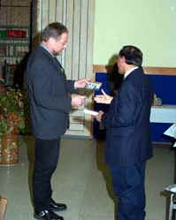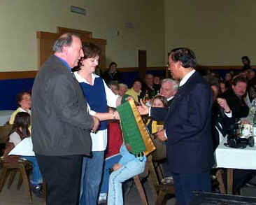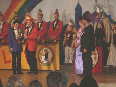 | Donebach/Limbach Bei der Prunksitzung der Wulle Wacken Limbach am 2. Februar 2002 überreicht der Sitzungspräsident Cornelius der Präsidentin der Dumbocher Turmspatzen Sieglinde den Orden der Karnevalsgesellschaft Wulle Wack Limbach e. V. Mit dabei das Prinzenpaar der Donebacher Andrea und Manfred. |
