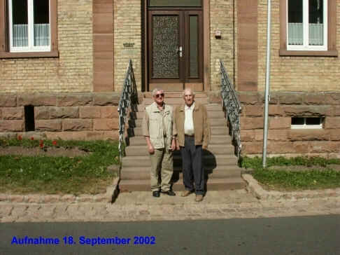 Die Söhne von Wilhelm Stelz besuchten am 18. September die Schule, an der ihr Vater 10 Jahre als Lehrer tätig war. Das Bild zeigt von links Hans und Rudolf Stelz vor dem Eingang des Schulhauses in Donebach. Hier wurde Rudolf Stelz 1925 geboren.