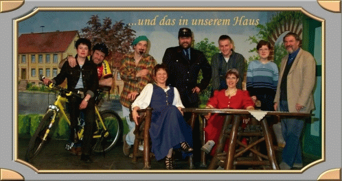 | ... und das in unserem Haus so hieß das Stück, das die Theatergruppe Knopfecke Donebach im Jahr 2002 aufführte. Eine ländliche Komödie, die von Rüdiger von Bergmann geschrieben wurde. Bei den Aufführungen, die im Sportheim in Donebach stattfanden, spielten: Bruckert Sieglinde, Sämann Hubert, Walz Siegfried, Sennert Salome, Hoffmann Benno, Schölch Kurt, Walz Annette. Regie führte Rüdiger von Bergmann, als Soufleuse fungierte Melanie Walz. Bühnenbild: Karlheinz Gräber |