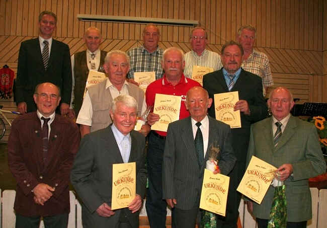 Und entsprechend jung und unterhaltsam hatten die Verantwortlichen um den 1. Vorsitzenden Hubert Sämann auch das Festbankett im örtlichen Sportheim gestaltet, bei dem u. a. langjährige Mitglieder geehrt werden konnten, deren Geburtsjahr mit dem Gründungsjahr des Vereins zusammenfällt. Der Chronik von Annette Walz war zu entnehmen, dass der „Wodan“ als ältester Verein im Dorf von je her nicht nur für die sonntäglichen Radtouren, sondern auch für das kulturelle und gesellschaftliche Leben im damalige Dumbach und heutigen Donebach verantwortlich zeichnete. Unter diesem Aspekt veranstaltete er neben der Teilnahme an Korsos, Festbesuchen und Ausflügen auch Weihnachtsfeiern, Theateraufführungen, Christbaumverlosungen, Fastnachtsveranstaltungen und Sommerfeste. Selbst bei weltlichen und kirchlichen Festen war und ist der Wodan stets präsent. Annette Walz erinnerte u. a. an die Glockenweihe oder den Festzug zum Jubiläum des Mudauer Musikvereins, aber auch an die Zwangsruhepausen des Vereins durch Kriege oder Aera bedingtes Desinteresse. Dennoch war der „Wodan“ von je her ein Stehaufmännchen und kann inzwischen auf über 200 Mitglieder , eine neu restaurierte Vereinsfahne und einheitliche Radlertrikots in den Vereinsfarben Rot-Gelb stolz sein. Und das sind sie auch - die Wodaner - stolz auf ihre Vereinsfarben, die sie gut sichtbar und damit sicher durch den Straßenverkehr bringen und stolz auf ihren Verein, der mit seinem überdurchschnittlichen ehrenamtlichen und kameradschaftlichen Engagement so wichtig für die Ortschaft war und ist. Nicht nur, dass er in seinem 3. Frühling seit 1983 von April bis September wöchentlich vier Radtouren in den unterschiedlichsten Schwierigkeitsstufen anbietet und bestens mit den örtlichen und allen Mudauer Vereinen zusammen arbeitet (Wir erinnern uns an den erfolgreichen Renner im Odenwald), er hat auch das Kriegerdenkmal in Donebach angeschafft, sich im alten Rathaus in Eigenregie ein Vereinsheim eingerichtet und pflegt das benachbarte Denkmal. Seine Spenden für die Spielplätze in Donebach und Ünglert waren unerlässlich und als jüngste Anschaffung gilt die Krippenfigur für die Filialkirche. Für diese empfahl Pfarrer Werner Bier in seinen Grußworten, sie auf den Namen Lazarus zu taufen. Denn der sei von Jesus auferweckt worden. Was der Chronik des Wodan mit seinen mehrfachen Auferstehungen doch sehr ähnlich sei. In den lobenden Worten von Bürgermeister Dr. Norbert Rippberger wurde noch einmal der Bekanntheitsgrad des Vereins deutlich, der bis weit über die Grenzen der Odenwaldgemeinde zum Werbeträger Mudaus geworden sei. Er gab auch seiner Bewunderung für die Gründungsväter Ausdruck, die ohne technischen Schnickschnack, Gangschaltung oder gar E-Bike bereits weite Strecken mit Odenwälder Höhenmetern zurück gelegt haben und sicher voll Stolz auf die heutige Generation mit deren engagierten ehrenamtlichen Wirken blicken würden. Ortsvorsteher Franz Brenneis schloß sich diesem Lob an und ließ die Gründungszeit mit Blick auf Baden und Dumbach Revue passieren. Wie verbunden sich die Wodaner mit Baden fühlen, sei schon an ihren Vereinsfarben ersichtlich. Und die Verbundenheit zum Verein selbst wurde bei den Ehrungen für 60, 50, 40 und 10 Jahre Mitgliedschaft deutlich. Wie Hubert Sämann so treffend bemerkte, lebt der Verein von seinen Mitgliedern, die ihn tragen. Gern und voll Stolz übernahm er die Aufgabe, so viele „lang gediente“ und jung gebliebene Mitglieder mit Urkunde und Präsent auszeichnen zu können. Seit zehn Jahren ist Michael Ehrmann dabei, seit 40 Jahren gehören Erwin Brenneis, Franz Brenneis, Werner Brenneis, Leo Damm, Gerhard Frank und Karl Werner zum Donebacher Radfahrverein und seit 50 Jahren Bruno Haas. Für stolze 60 Jahre Mitgliedschaft im „Wodan“ wurden Bernhard Grimm, Walter Kugler, Hermann Müller, Franz Scharmann, Walter Scheuermann und Willi Weimer – alle aus dem Ünglert mit offensichtlich besonders gesunder Luft – sowie Alfons Köhler, Karl Schäfer und Erwin Volk gewürdigt, bevor Trudbert Mechler als 2. Vorsitzender des „Wodan“ das Mikrofon übernahm, um einen völlig verdutzten Hubert Sämann für 18 unbeschreiblich engagierte Jahre als 1. Vorsitzender mit Urkunde und Präsentkorb auszuzeichnen und zu danken. Gabi Sämann wurde als „mitgewählte“ Frau des 1. Vorsitzenden mit einem Blumengebinde bedacht. Im Namen der örtlichen Vereine gratulierte Norbert Schnetz, der die 18-jährige Ehrung kommentierte mit „Nun ist der Hubert volljährig und darf praktisch jedes Fahrrad fahren“. Wie volljährig er ist, hatte Sämann bereits bewiesen, als er es im Namen der Wodan-Mitglieder abgelehnt hatte, den diversen Verbänden bis hin zum Bundesverband beizutreten, nur um evtl. und möglicherweise Rennen wie den „Renner im Odenwald“ ausrichten zu dürfen. Denn das hätte bedeutet dass der Jahresbeitrag nahezu verdreifacht werden muss. „Das konnte ich unseren treuen Mitgliedern einfach nicht zumuten“. Da lieferte er doch lieber „als Vereinsdiener des Wodan seit über 50 Jahren“ in einem 5. Zwerchfell trainierenden Grußwort die „richtige und einzige Wahrheit“ über den 1. Vorsitzenden und über E-Bike-Fahrer im Verein, bevor er als Hubert Sämann all den fleißigen Helfer dankte, die zum Gelingen des Festbanketts beigetragen hatten und zum gemütlichen Teil des Abends mit Tanz zur Musik von „No limit“ überleitete.
